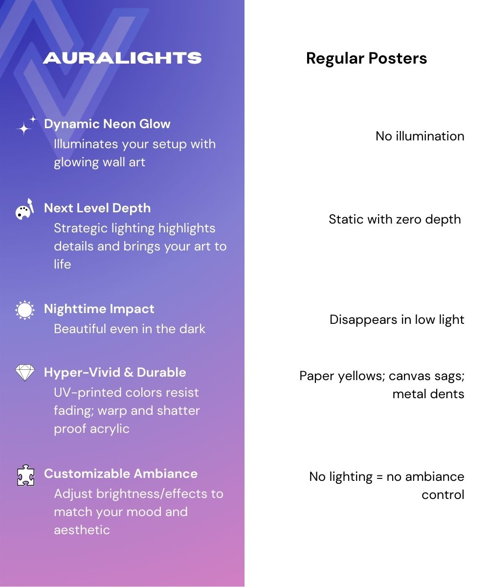 Explore our Anime & Gaming Wall Art + Lighting Guide to see how AURALIGHTs™ differ from CHROMAFRAMEs™, Acrylic Posters, Neon Signs, and more.