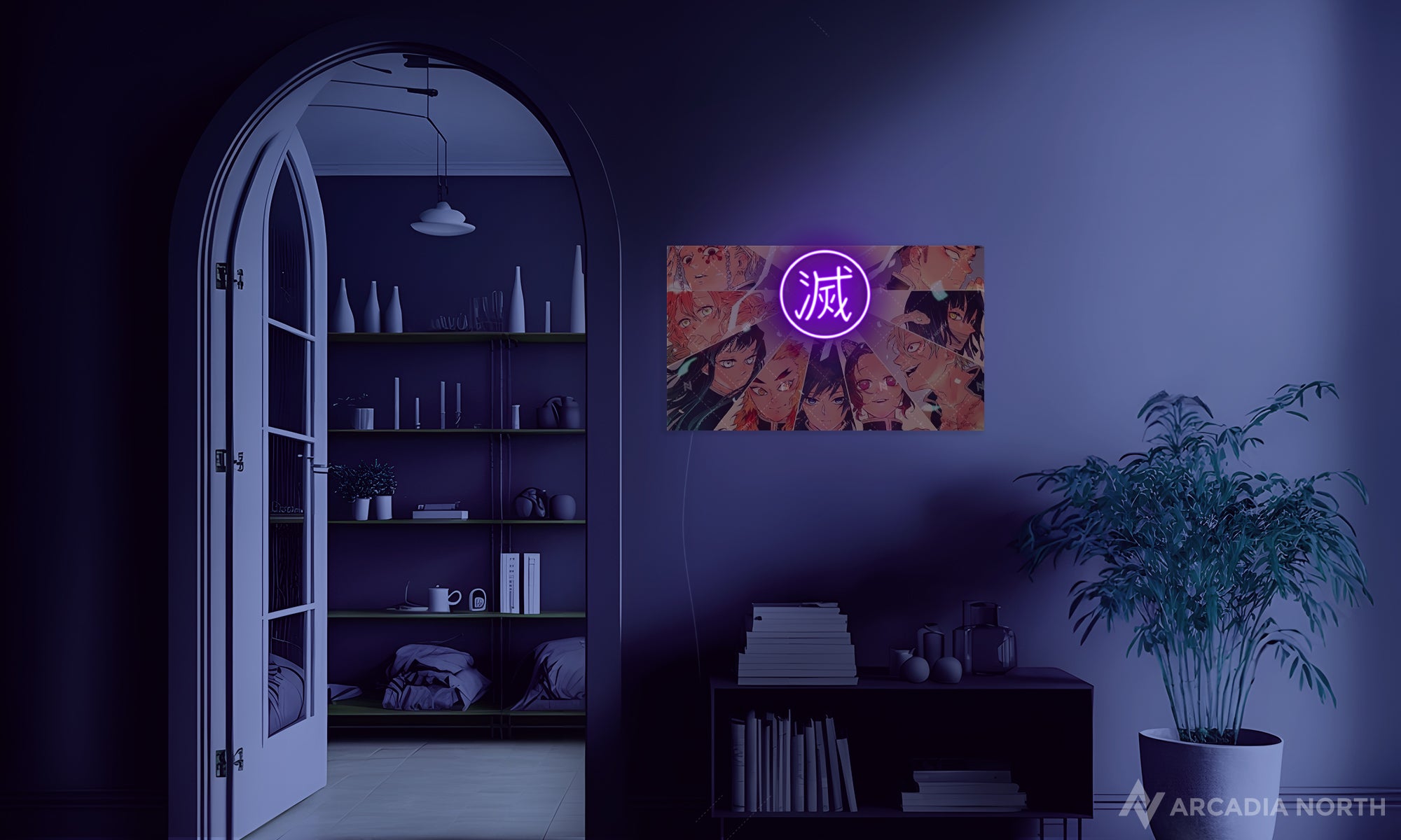 The Arcadia North AURALIGHT™ is a premium acrylic print with built-in LED neon lighting that highlights key parts of your favorite designs. Add 3D depth that flat prints can't match - neon accents that make symbols pulse and eyes pierce through shadows.